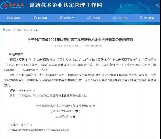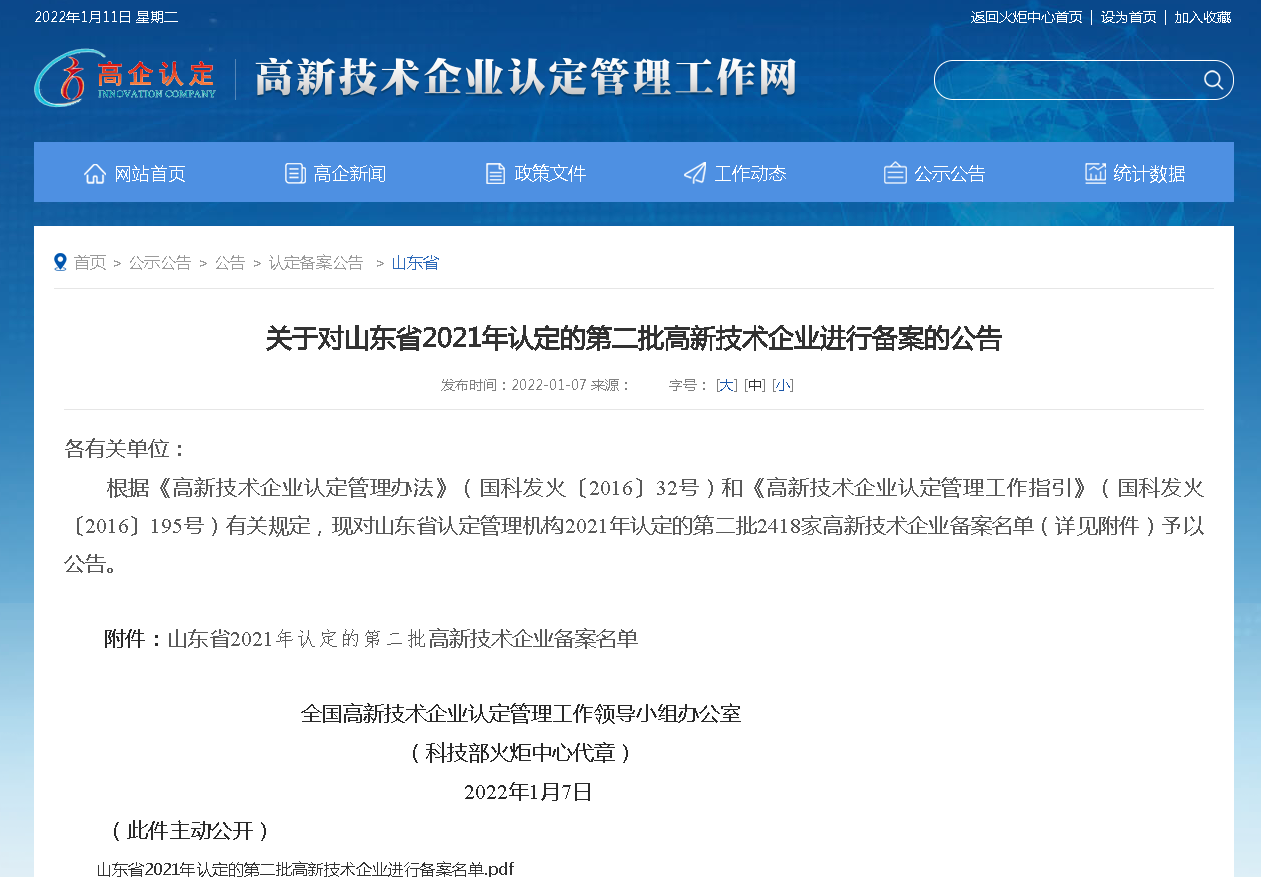 1月7日,全國高新技術(shù)企業(yè)認定管理工作領(lǐng)導(dǎo)小組辦公室發(fā)布《關(guān)于對山東省2021年認定的第二批高新技術(shù)企業(yè)進行備案的公告》。青島能安恒信科技有限公司成功列入《山東省2021年認定的第二批高新技術(shù)企業(yè)備案名單》。