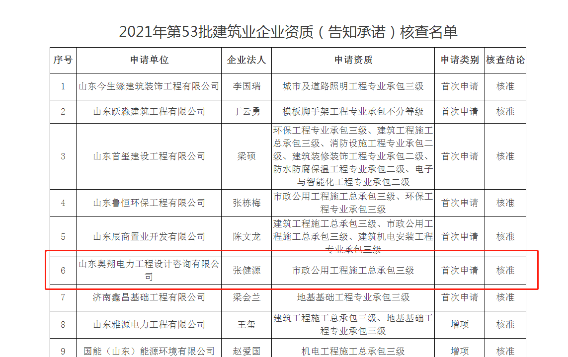 近日,濟南市行政審批服務(wù)局發(fā)布《關(guān)于2021年第53批建筑業(yè)企業(yè)資質(zhì)(告知承諾)核查名單的通告》,山東奧翔電力工程設(shè)計咨詢有限公司獲得由濟南市行政審批服務(wù)局頒發(fā)的電力工程施工總承包三級資質(zhì)。