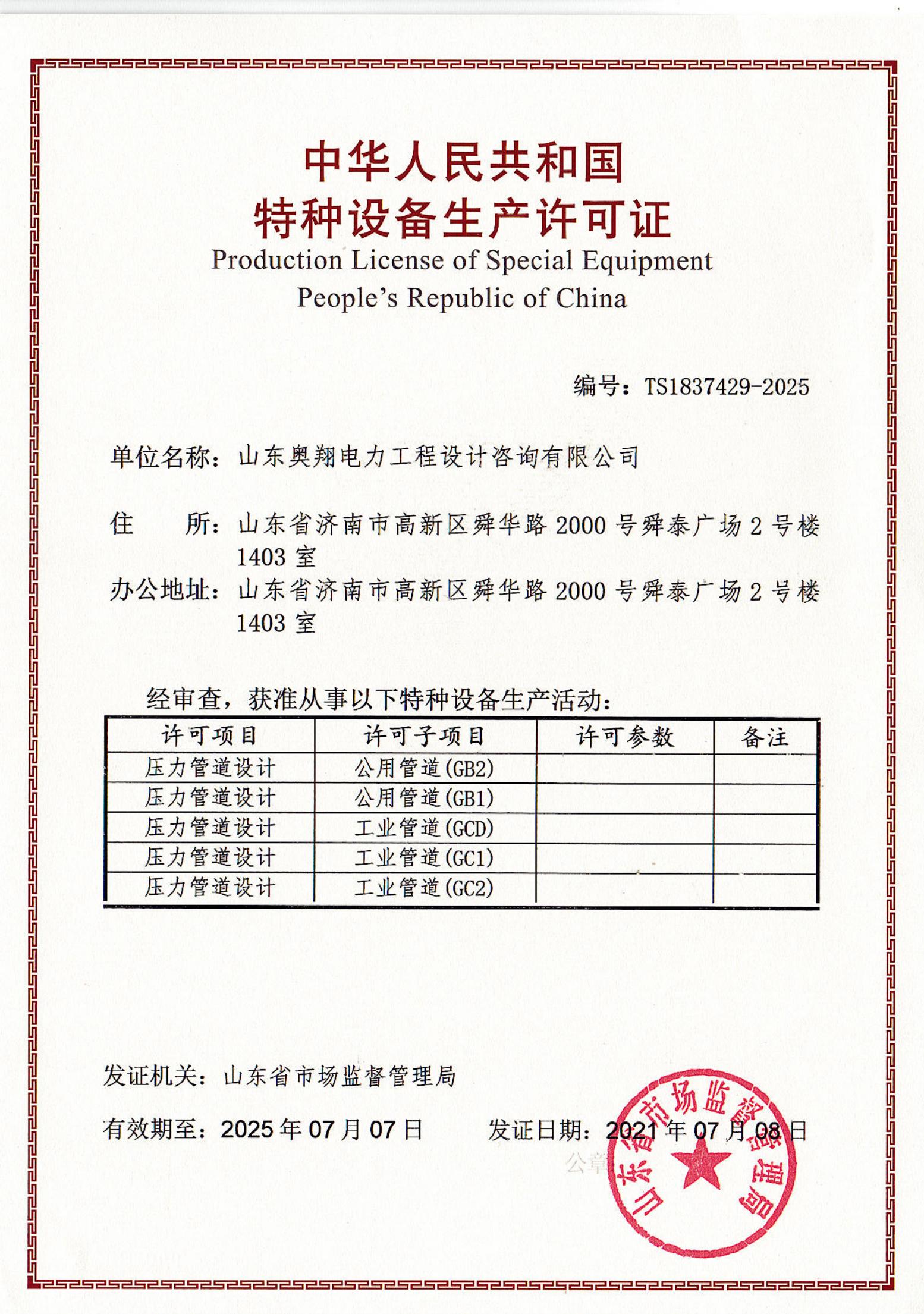 近日,在山東省市場監(jiān)督管理局最終審核后,山東奧翔完成了特種設(shè)備設(shè)計(jì)許可證書換證工作,實(shí)現(xiàn)了GB1,GB2,GC1,GC2,GCD級別壓力管道設(shè)計(jì)特種設(shè)備許可證的延續(xù)。