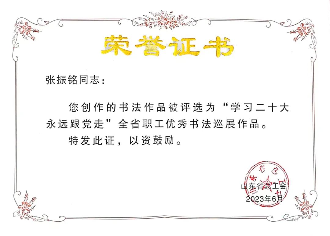 奧翔公司員工張振銘書法作品被評(píng)為全省職工優(yōu)秀書法巡展作品